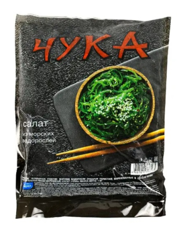 морские водоросли (Ундария перистая) резаные отварные маринованные, вода питьевая, масло кунжутное нерафинированное, сахар, соевый соус (содержит соевые бобы, пшеницу, соль, усилители вкуса и аромата: Е635, Е627, Е631, Е621, консервант Е211, подсластитель
