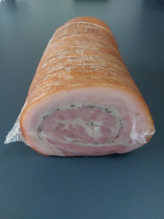 грудинка свиная бескостная, нитритно-посолочная смесь (соль пищевая, фиксатор окраски - нитрит натрия), животный белок (свиной), регулятор кислотности Е451(i), крахмал картофельный, декстроза, антиокислители (Е301, Е330), экстракт дрожжей, ароматизатор (
