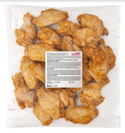 плечевая и локтевая части крыла цыплят бройлеров, вода, подсолнечное масло, сахар, кукурузный крахмал, соль, сушеные томаты, чеснок, перец чили, паприка, черный перец, сухой глюкозный сироп, дрожжевой экстракт (содержит ячмень), петрушка, краситель Е160с,