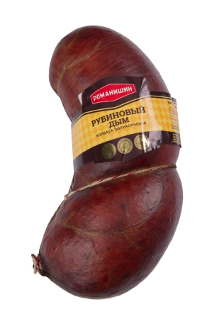 Само название отражает внешний вид колбасы, оболочка рубинового цвета с деликатным копчением.