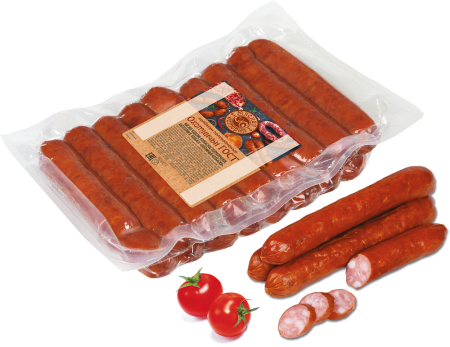 свинина, говядина, шпик, вода питьевая, нитритно-посолочная смесь (соль, фиксатор окраски (нитрит натрия)), специи и экстракты специй (перец белый, кориандр, чеснок), регуляторы кислотности (цитраты натрия, ацетаты натрия), декстроза, соль, усилитель вкус