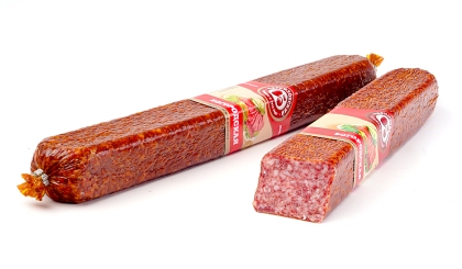 свинина, шпик, вода, соевый белок, филе куриное, соль, декстроза, стабилизатор (пирофосфаты), регуляторы кислотности (трифосфаты, глюконо-дельта-лактон), ароматизатор, усилитель вкуса и аромата (глутамат натрия 1-замещенный).Белки 21гр,жиры 48гр,Ккал 516.