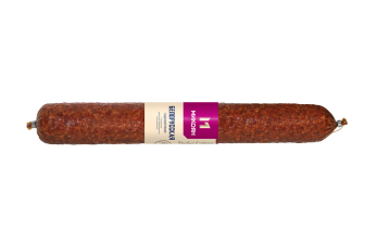 свинина, филе грудки курицы, жир говяжий, шпиг, вода, посолочная смесь (поваренная соль, фиксатор окраски нитрит натрия), животный белок, глюкоза, специи и натуральные ароматизаторы (тмин, чеснок, паприка, мускатный орех, чили, черный перец, лимон), крахм |