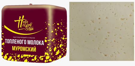 Сыр «Муромский» – полутвёрдый сорт в крупном кубе со вкусом топлёного молока. Отличается бархатистой текстурой с небольшими «глазками» и лёгкими карамельными нотами. Сыр легко режется, не крошится и равномерно плавится, оставаясь нежным и ароматным.