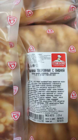 Тесто-продукт творожный (вода, заменители молчного жира, молоко сухое обезжиренное, стабилизатор консистенции (пищевые волокна,крахмал кукурузный), изолят соевого белка, регулятор кислотности Е331, краситель-каротины, консервант-сорбат калия, препарат мо