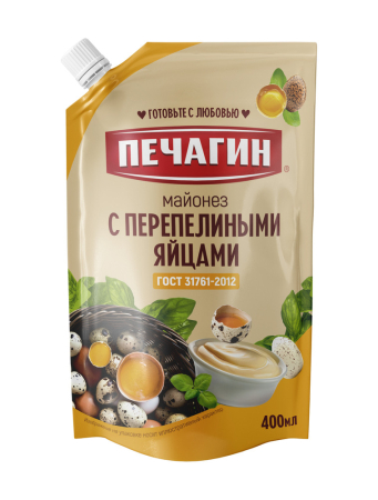 Масло подсолнечное рафинированное дезодорированное, вода, яичные продукты (яичный желток, меланж из перепелиных яиц) соль, эфирное масло горчицы, пищевые добавки (загуститель крахмал картофельный (Е1414), регуляторы кислотности (уксусная кислота, лимонная